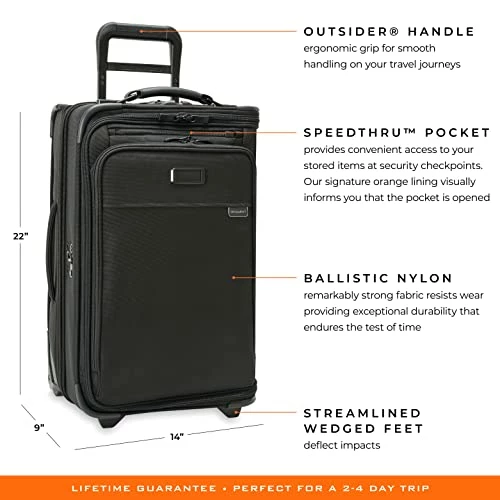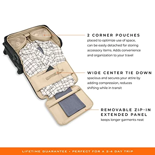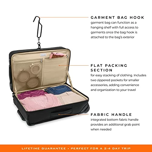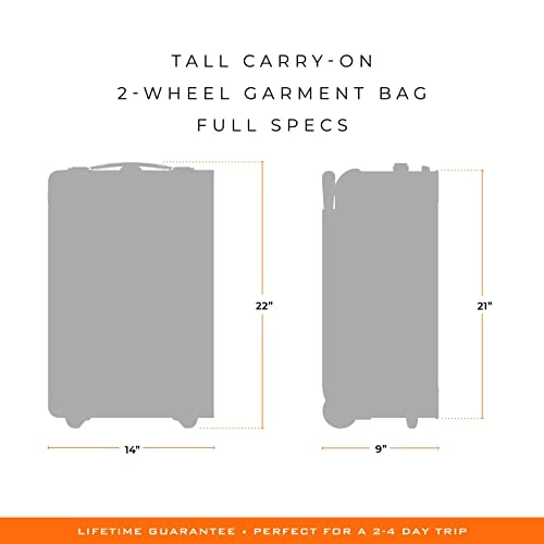 Details: The Briggs & Riley Tall Carry-On Garment Bag (22″ x 14″ x 9″) meets carry-on regulations for most U.S. domestic airlines. The spacious center tie down in suiter compartment secures your attire by adding compression and reduces shifting while in transit. 2 corner pouches are strategically placed to optimize use of space. They can be detached for storing accessory items. High-density wheels offer superb smooth rolling. Encased in impact resistant material to increase protection, which ensures durability for countless miles. The proprietary shock absorbing spinner wheels offer 360 maneuverability and smooth quiet gliding for effortless navigation. Designed with self-repairing YKK RC zippers call for smooth zipper action with lockable zipper pulls. Bag can be cleaned with a soft, damp cloth or an adhesive lint brush roller. If your bag is ever broken or damaged, we’ll repair it free of charge, no proof of purchase needed, no questions asked.