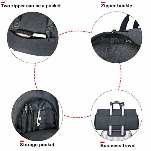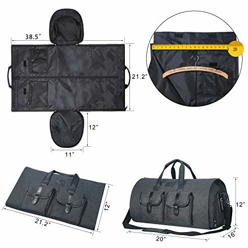 - LARGE CAPACITY DUFFEL BAG – After assembled, this garment duffel bag work perfect as a 45L duffel bag. Thanks to multiple interior zipper pockets, it maximizes storage capacity, holding everything from suits, dresses to shoes and ties For even more space, we added an exterior pocket that provides easy access to electronics and travel or business documents, so you can just focus on having a fantastic trip!