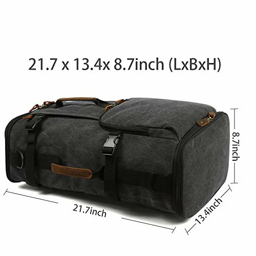 Details: Features: – Made of high quality cotton canvas and Genuine Leather, classic and fashionable. – Structure: 1 Main zip pocket, 3 front zip pockets, 1 side mesh pocket and 1 laptop compartment. It’s unisex for men and women and worn by teens, perfect for business, school, day trips, hiking.Be ready for any situation. – Large Capacity:13.5″L x 22″H x 9″W(Large size), it can hold most 17 inch laptop. Roomy enough for your clothes, laptops, phones, books, shoes,keys and so on. – Thicken breathable strap design, comfortable to carry. – The front zipped pocket can hold your ipad mini / kindle, and the small pocket for wallet, Glasses and other small gears. – This bag can used as duffel/handbag/suitcase/brief case when traveling. – Two durable straps are in a hidden compartment to make this bag a backpack/rucksack/satchel. – A detachable shoulder strap can easily turn the backpack into a messenger bag/crossbody bag/mail bag/shoulder bag. – Awesome backpack for outdoor, working, traveling, hiking, camping, school and everyday using. Package includes: – 1 * Backpack and 1* shoulder strap Washing instructions: – Washing with clean water with ordinary temperatures. – DO NOT washing with hot water. – Hang to dry. – Washing separately to avoid staining.