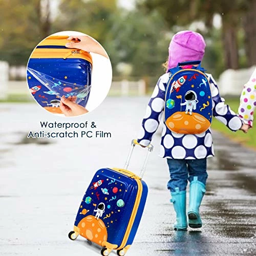 - 🌠 【Durable Material & Waterproof Design】 The luggage is made of non-toxic ABS, polycarbonate and nylon materials. The safe and durable materials guarantee your child’s health. In addition, the hard shell covered with the PC film can be effectively waterproofed and prevent scratches.
