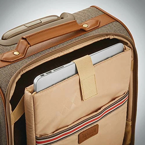 Details: Hartmann’s herringbone deluxe carry on spinner is the perfect choice for a trip abroad, a long vacation, or luggage-sharing with your travel companion. Updated with archival elements such as the Hartmann Ducord stripe and modern features such as USB ports, the contemporary design is executed in sleek nylon, built with a lightweight honeycomb frame, and highlighted with polished hardware. A wide, 12 position, contoured handle flexibly fits each traveler’s physiology while the best-in class wheel system with steel Cartridge bearings creates an exceptionally comfortable and smooth travel experience. The well-considered interior offers multiple packing options, and a padded, tri-fold suiter, ensuring easy packing and organized arrivals.