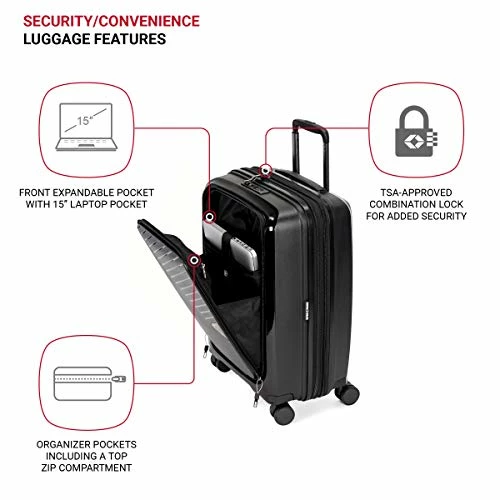 Details: A sleek, stylish case, the SWISSGEAR 8836 20” Expandable Laptop Carry On Hardside Spinner Luggage is bringing modernity to your wanderlust journey. Propped on eight 360-degree spinner wheels, its front zip compartment features two slip pockets, a small zip pocket, and a 15” laptop sleeve with a protective hook and loop closure. Unzip its split-case design to find elastic tie-down straps, a large side pocket, and a mesh pocket to organize outfits and travel essentials. For added security, its TSA locking system includes a three-digit combination and locking zippers that pops open with a push-button. Lift its locking, telescopic handle or grab its supple molded handle and revel in a seamless adventure.