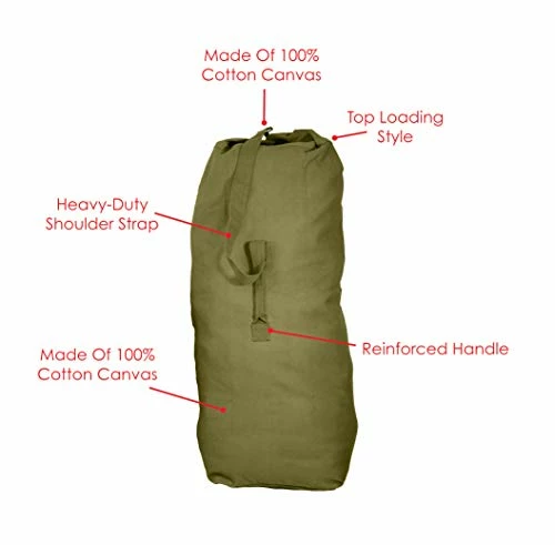Details: Canvas Duffle Bag O. D. 50β x 30βTop loading style with a cotton web shoulder strap and a reinforced web side handle. Comes with a snap hook closure