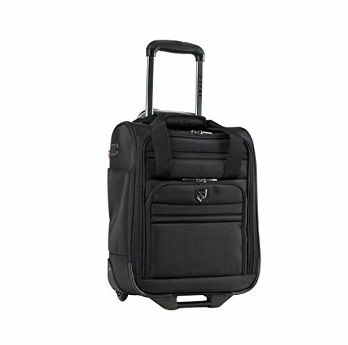 Details: Travelers Club 17″ rolling under-seater features a locking telescopic handle, easy glide wheels, interior packing areas and a side USB port. (Charger not included). Has a patented “Flex-File” storage system. Can be revoved for additional packing space. Made of deluxe 1,680 denier ballistic polyester. Meets most airline carry-on/under seat restrictions.