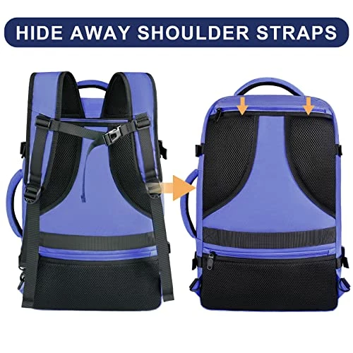 - ✈【BUILT FOR TRAVEL】: This purple carry on backpack for women is designed with hideaway padded shoulder straps which can be hidden away in the back zippered compartment when not using, transforming carry on backpack into suitcase backpack. Two padded grab handles are set on the top and the side of the luggage backpack, which allow an easy switch between backpack and suitcase. A luggage strap on the back is designed to fit on suitcase for easy carrying. It’s the best gifts for travellers women